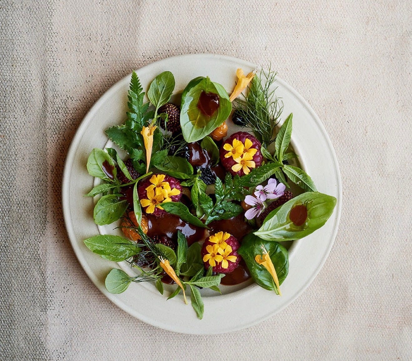 Salad with dried berries and herbs with warm chocolate sauce, summer 2025 menu | photo credit: nomacph